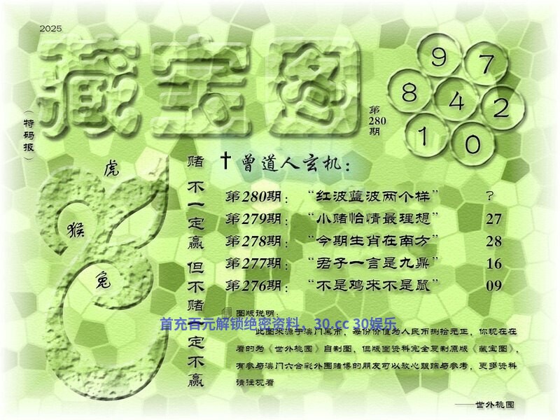 280期:红波蓝波两个样 解释:红波蓝波两个样,解双肖虎龙猴鼠狗马 藏宝九肖:虎龙猴鼠狗马牛鸡猪 |