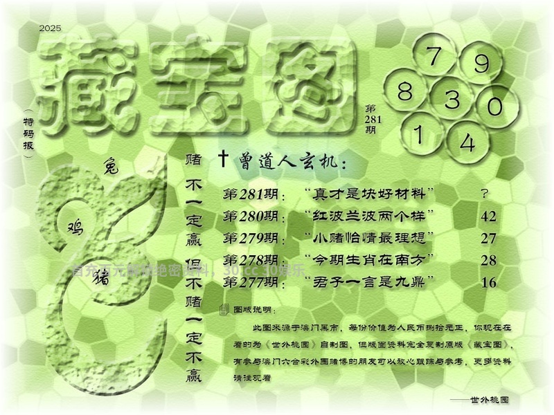 281期:真才是块好材料 解释:真才是块好材料,解美肖蛇鸡龙马羊兔 藏宝九肖:蛇鸡龙马羊兔鼠虎狗 |